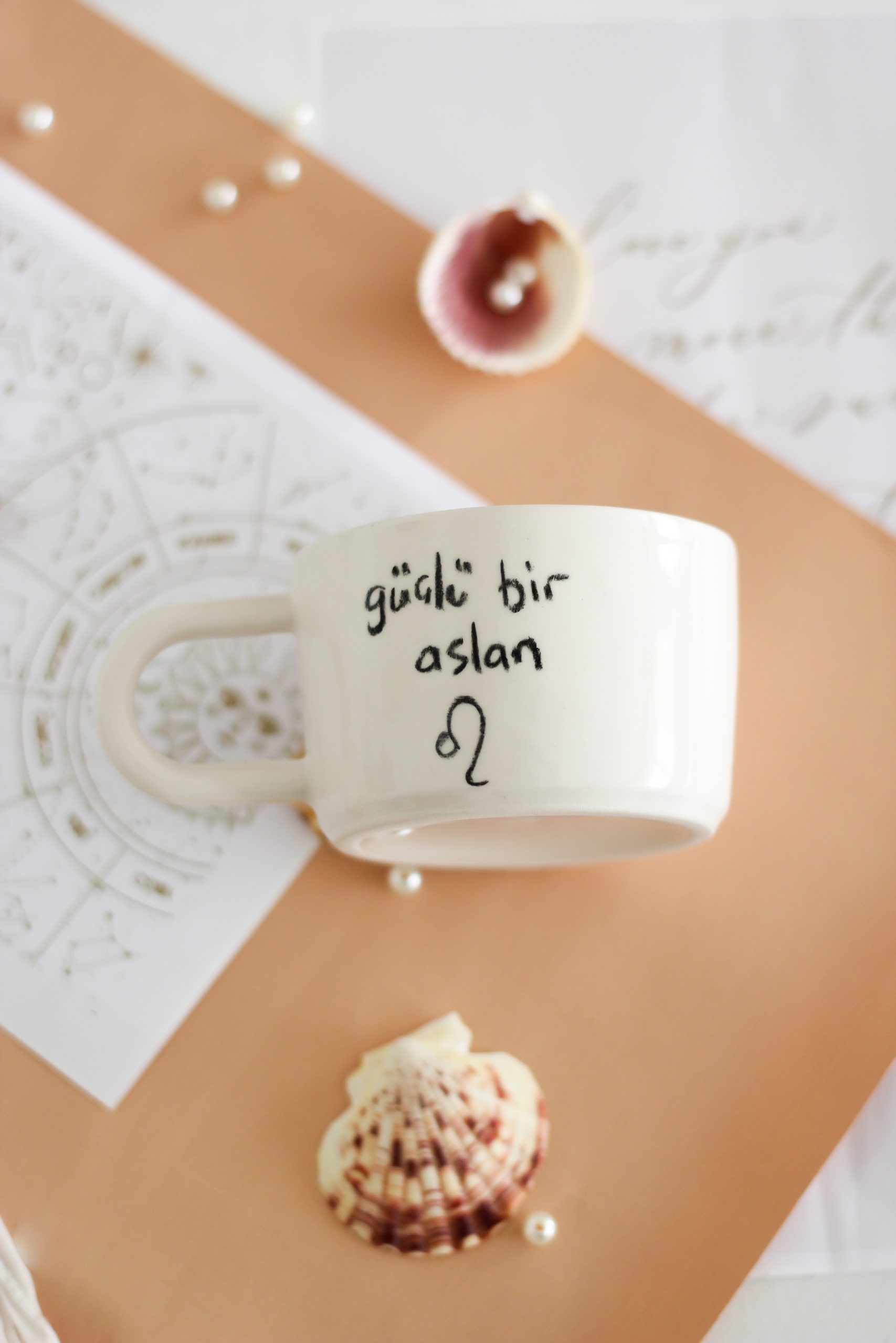 El yapımı Aslan burcu temalı geniş seramik kupa