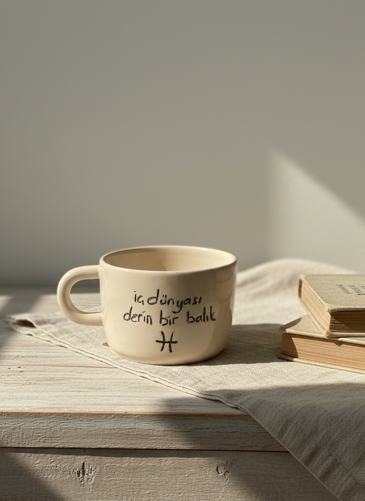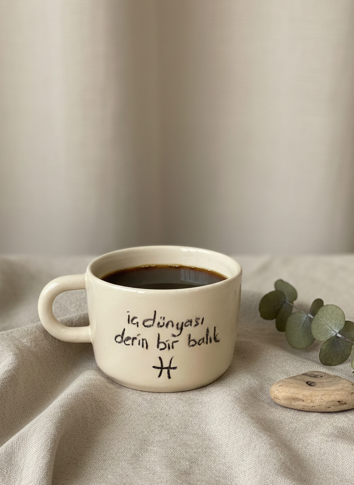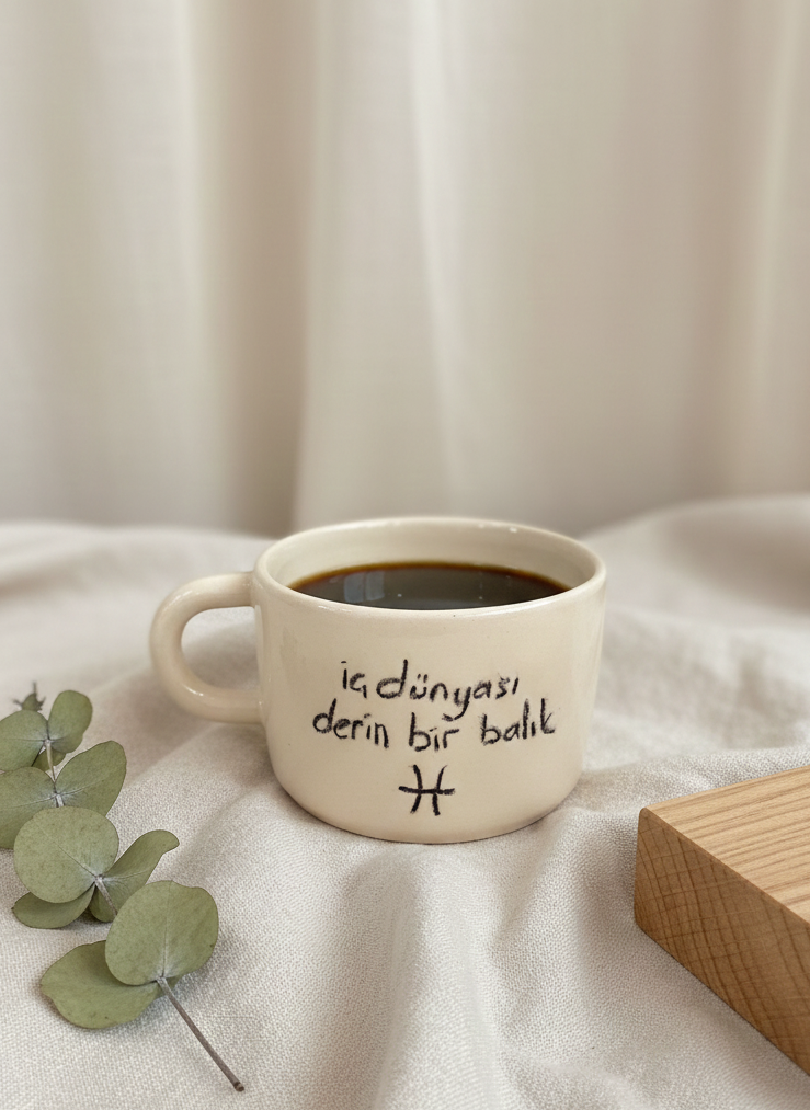 El yapımı Balık burcu temalı geniş seramik kupa