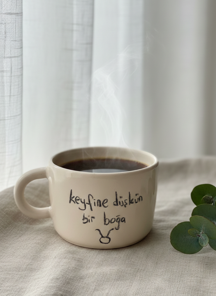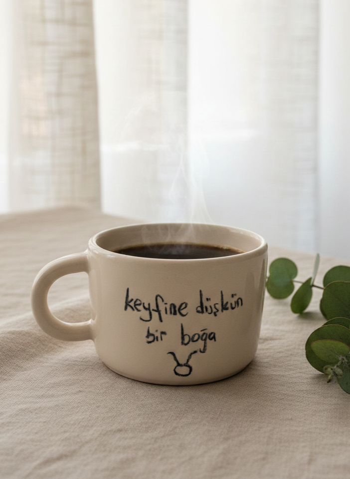 El yapımı Boğa burcu temalı geniş seramik kupa
