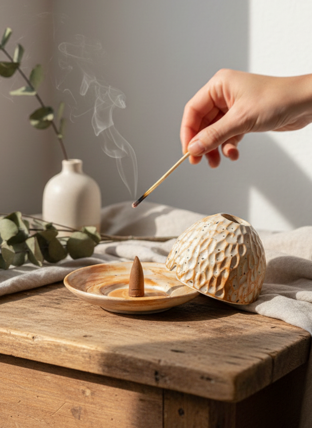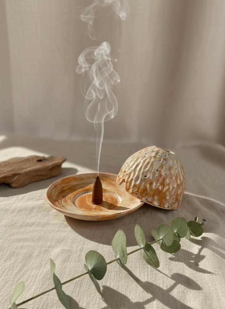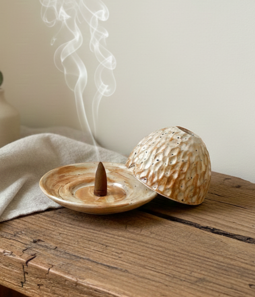 Alt tabağı sayesinde tütsü külünü güvenle toplar, üst form ise dumanın yumuşak bir şekilde yayılmasını sağlar. Günlük ritüellerinizde, meditasyon anlarınızda ya da yalnızca bulunduğunuz alanı dahahuzurlu hissettirmek için kullanıma uygundur.