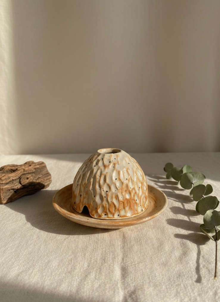 Doğal dokusu ve sade formuyla tasarlanan bu el yapımı seramik tütsülük, bulunduğu ortama sakin ve sıcak bir atmosfer katar. Yüzeyindeki akışkan doku ve doğal tonlar, her parçayı kendine özgü ve benzersiz kılar.