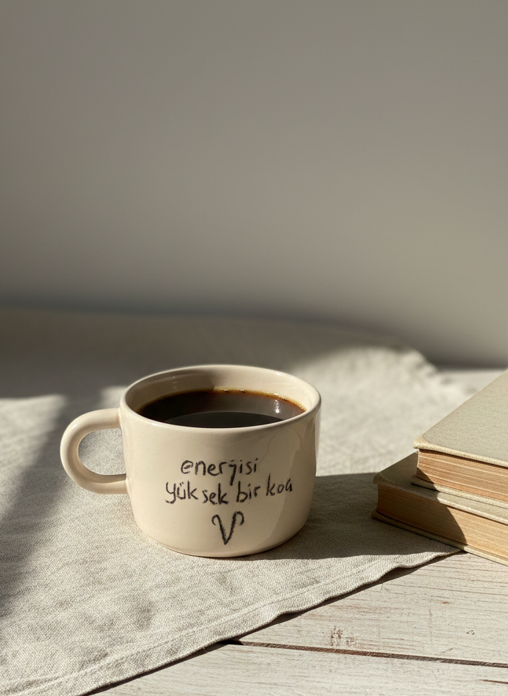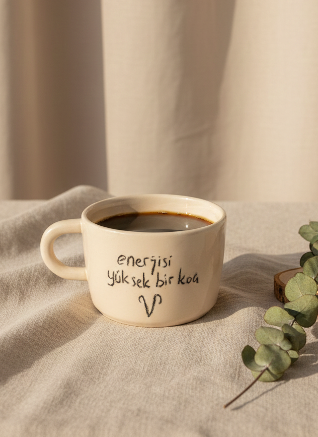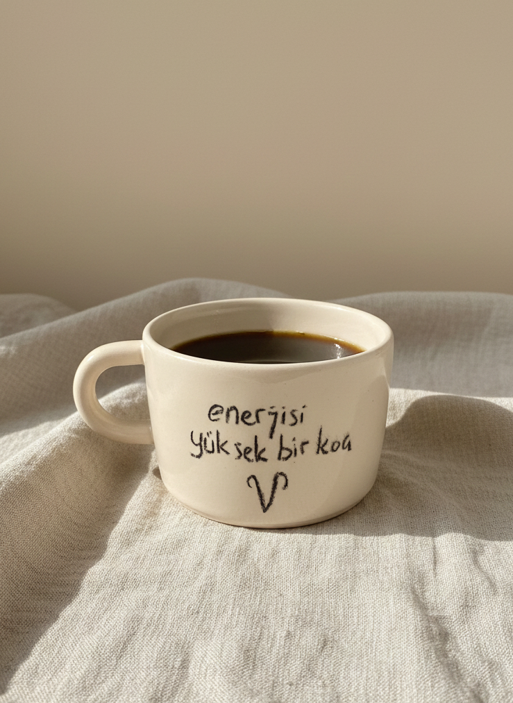 El yapımı Koç burcu temalı geniş seramik kupa